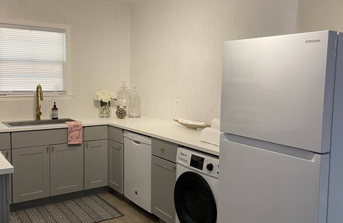Brand new kitchen includes large sink and champagne gold faucet. Plenty of amenities are available to whip up a tasty meal including gas stove/oven, overhead microwave, and plenty of cookware. Make clean-up a breeze by utilizing the dishwasher. Store cold drinks and food in the full-sized fridge with ice maker.