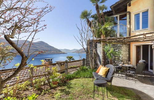 Casa La Palma, a rustic 2-family house, offers a tranquil vacation rental in Ronco sopra Ascona, Porto Ronco, Switzerland. Surrounded by trees and perched at 320 meters above sea level, this detached property boasts a small, beautiful, well-kept fenced garden with a pergola. Enjoy the convenience of a central heating system, Internet Wifi, Parking, and a Yard during your stay.