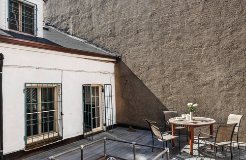The loft itself occupies the top two floors of a lovely, converted 19th century brick counting house, combining the bohemian feel of a loft (2400 sq. feet) with the privacy and understated luxury of a townhouse. It has two+ bedrooms, two full baths, a spacious kitchen fitted out with high-end appliances, (including a nespresso machine and a new Bosch cooktop) and a private terrace off the kitchen. There is a dishwasher, washer/dryer, A/C, cable TV, a DVD player and wi-fi internet.