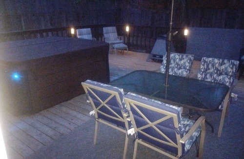 Twenty-one horse power, oversized therapeutic spa with 54 jets and deep tissue massage, two lounges, fountain and waterfalls, seats seven comfortably on back deck with private entries from bedroom or living room.