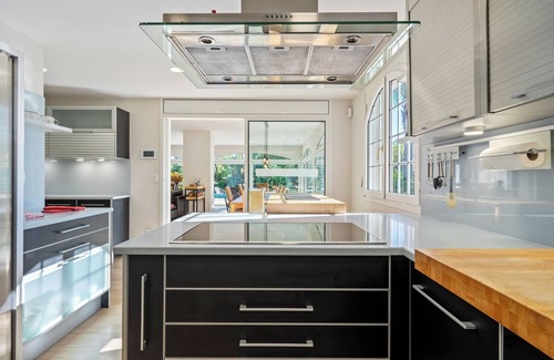 The kitchen has: An oven, microwave, dishwasher, very large ceramic stovetop, 3 different coffee makers, 2 large refrigerators, 1 large freezer, a toaster, a kettle, an endless supply of dishes, kitchen and table cutlery, serving platters, salad bowls, Tupperware, oven mitts, tea towels, paper towels, paper napkins, tall and short glasses, wine glasses, spirits glasses, coffee or tea cups of various sizes, dishwasher tablets, dish soap and hand soap, a complete set of pots and pans, children's tableware, and a large pantry.