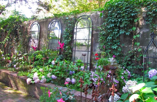 --Private landscaped garden and patio with outdoor dining table, bistro table, and grill.