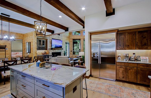 Luxury cabin offers the perfect getaway for couples or families. This 4 bedrooms has a CA king bed in master bedroom, Queen size bed in bedroom 2, two full beds in bedroom 3 and King bed and bunks beds in bedroom 4 (loft). Three smart TV's are in great room, master and loft. From the front door you enter into a large open floor plan consisting of dining, kitchen, great room with 24 ft ceilings. Large windows bring great natural lighting.