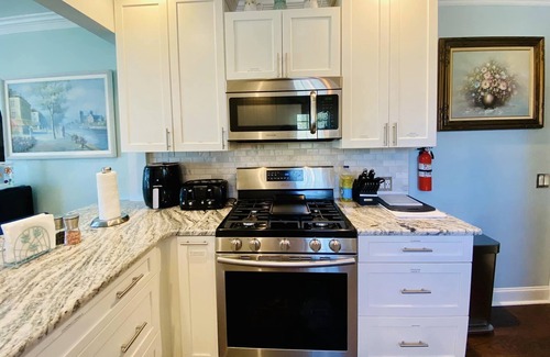 There is off-street parking in the driveway and secured entrances with access via a keypad. the home is well lit at night and there are security cameras all around for guest safety.