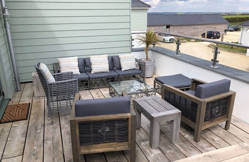 Opening out from the lounge is a large roof terrace with outdoor dining table and chairs for eight to ten people. There is also a smaller balcony overlooking Burgh Island. A separate large patio area offers dining as the sun sets over the sea, with seating for eight to ten people.