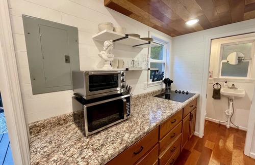 Enjoy the seclusion of this Luxury Tiny home with loft and bedroom in the trees set in the middle of the Cherokee National Forest while relaxing in the large outdoor space . Enjoy a covered 14x16 outdoor space with 14foot fireplace and Hottub set on 34 acres . Private hiking trails on the property -bordering the Cherokee National Forest. Added amenities include upgraded linens, soft robes, complimentary champagne, coffee, water, snacks and bundle of firewood.