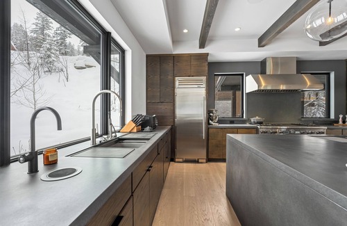 You will step into this exquisite multi-level home through the front door on the main level, which features the living room, kitchen, and dining areas. This space is highlighted by soaring wood beam ceilings and expansive floor-to-ceiling windows that showcase breathtaking views of the mountains! The living room boasts an open sleek contemporary design and is furnished with luxury pieces. Amenities include a cozy gas fireplace, an oversized sectional, a Smart TV, a Sonos sound bar, and slope-side views. The lower-level living room: This area serves as the perfect retreat after an eventful day on the slopes! Relax on the cozy sofa seating while watching your favorite shows or movies on the smart TV. Challenge friends or family to an exciting game of Golden Tee, or gather around the game table for a fun round of cards. For added convenience and enjoyment, the space also features a bar area equipped with built-in wine fridges. Access off this area to the lower-level patio where you will find the hot tub and the ski in/out access. The lower-level theater/ bunk room features tiered seating with six fully reclining movie theater chairs, perfect for unwinding while enjoying three Smart TVs. Adjacent to the theater room, a separate space provides extra sleeping arrangements, including a Queen-over-Queen bunk bed and a sofa. The ski room area is a skier's paradise. It features a fully equipped ski room with ski lockers and boot racks for easy storage. Additionally, the space includes a full-size washer and dryer, providing a convenient way to quickly clean your ski gear. For added comfort, a full bathroom with two showers is also located here. Entertain in a sleek modern kitchen equipped with concrete countertops and top-of-the-line Thermador appliances. The kitchen features an oversized waterfall island with seating for 6. Enjoy your morning coffee from the plumbed-in coffee system! Adjacent to the kitchen is a dining area with a large modern dining table that seats 10, under the warm glow of a contemporary chandelier. Find access to the outside patio off the dining room.