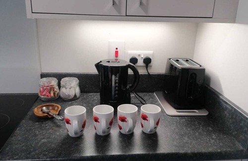 The holiday home has 2 bedrooms, one with a king size bed and the other with a small double (4ft) bed, blackout curtains for a perfect nights sleep, a flat-screen TV with streaming services, a fully equipped kitchen with an oven and a microwave, a washing machine, and 1 bathroom with a shower. Towels and bed linen are offered in the holiday home. Additional in-room amenities include chocolates or cookies.