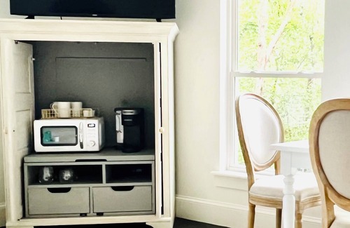 Step into the light and bright Magnolia Suite and you'll feel that instant relaxed feeling. The room has a large comfy sectional sofa that will make you want to curl up and read a book or watch your favorite Netflix shows on the 50" Smart TV. The space is newly renovated and features a King size bed with fresh soft linens and fluffy pillows. There is a table that can be used for dining or as a desk for working remotely. High Speed internet will keep you online if you must work while visiting. The spa-like bathroom is completely new with an oversized glass and tile shower, pedestal sink and oversized towels. Shower products and a blow dryer are provided. The floor to ceiling windows provide a view a lush wooded area at the back of the home where the Suite is located. A ramp to the private deck equipped with seating and a gas bbq grill is a bonus. We provide coffee pods, creamer, sugar, tea bags, coffee cups, wine glasses, wine & bottle opener, disposable dishes and cutlery, ice, beach towels, noise machine for sleeping & a clothing steamer.