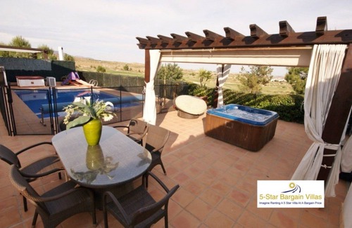 Cleopatra Villa 1000 villa with majestic views over the golf course to the Mar Menor. The villa is in a gated community with a Private Heated Pool (extra cost applies), 6 person Jacuzzi, yes its heated, table tennis, sun loungers, Gas BBQ, outdoor dining table for 8 people, and only a 5 minute walk to the club house.