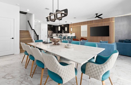 Bright, chic, and light-filled, the open-plan living/dining space is the perfect prelude to this fabulous abode. White marbleized floors complement the bright and beautiful accent furnishings, including two cozy-chic orange couches facing two additional plush chairs. Transition from lounging to feasting at the sleek white table, which comfortably seats 10 in its glam teal and gray dining chairs.