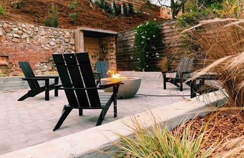 Welcome to our freshly reimagined studio haven, an upstairs unit designed to comfortably host up to 2 guests! This chic, modern retreat features a well-appointed kitchenette and a cozy living space—perfect for relaxing after a day of adventure. Traveling with a larger group? Pair this unit with any of the 5 other unique rentals on-site, including a nearby 3-bedroom house, to accommodate up to 24 guests for retreats, reunions, or special celebrations. Bonus: eco-friendly explorers will appreciate the on-site EV chargers. Your ideal getaway starts here! Discover Platforms, the property’s standout communal outdoor retreat, where stunning landscaping creates the perfect backdrop for relaxation and fun. This inviting space welcomes you with open-air showers, a luxurious hot tub, glowing fire pits, and playful amenities like corn hole and hammocks. Unwind under shaded umbrellas or sink into comfy chairs, soaking in the tranquil charm of this unique oasis.