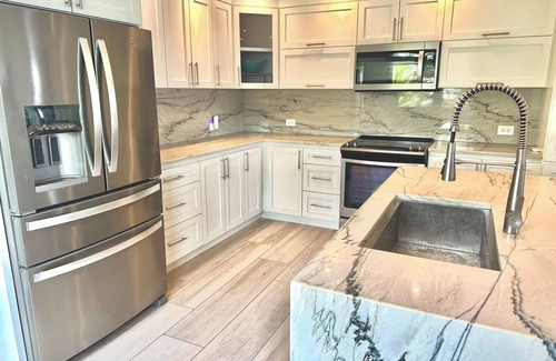 The home is completely remodeled inside and out with a large pool, real HOT TUB at 104 degrees (or your preference), and a huge patio. The main level has the main kitchen, dining room, main living room, bedroom with laundry and additional vanity (2 Queen beds), primary bedroom with bathroom (King bed). Downstairs has a 2nd full kitchen, 2nd living room, 1 king bedroom, 1 bedroom with 2 queens.