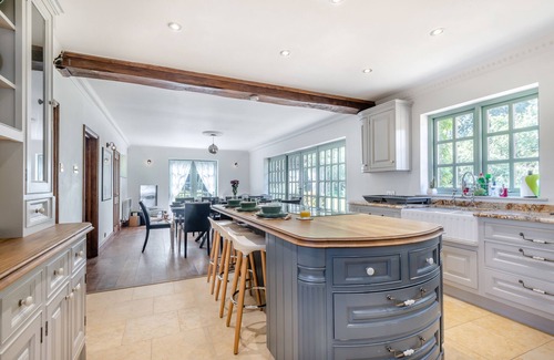 From the moment you arrive, the house is sure to impress. A long, leafy driveway lined with walnut trees leads to this striking red-brick home, known locally as The Propeller House thanks to its distinctive three-wing design. Set amidst wildlife-rich grounds, it's like staying in your own private nature reserve — keep your eyes peeled for deer, squirrels, and an abundance of birdlife. Inside, the house blends period charm with modern comfort. Spacious and light-filled rooms feature original wooden beams and floors, while the thoughtful layout caters beautifully to larger families or groups. The welcoming entrance hall leads to the first of seven bedrooms — a ground-floor king-size — and the heart of the home: a generous open-plan kitchen/diner/lounge. This warm, sociable space features a farmhouse-style kitchen with central island, formal dining area, and a comfy seating nook with Smart TV — perfect for keeping everyone together while meals are prepared. A second lounge with Sky TV and a wood burner offers a quieter space for cosy evenings, and a third snug area with its own TV is ideal for film nights or relaxed downtime. A utility room and downstairs cloakroom complete the ground floor. Upstairs, six additional bedrooms accessed via a choice of two staircases offer a restful retreat for all guests: two king-size, two doubles, and two cosy twins. The largest king room also boasts a private dressing area and en-suite with shower and WC. Two shared bathrooms (each with a bath and shower), plus an additional WC, ensure comfort and convenience for larger groups.