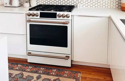 Fully equipped kitchen with gas stove and cooking supplies, including an instant pot, blender, toaster, microwave, Café coffee maker, hot water kettle, ample pantry space, and quiet dishwasher with detergent pods.