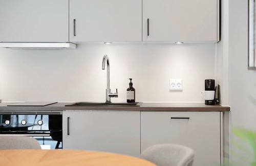 The bathroom is a full bathroom with both a shower, toilet and washing / drying facilities. The bathroom offers shampoo, conditioner and soaps. Additionally, you will have fresh and clean towels for body, floor and hands for your entire stay. You will also find ironing equipment in the apartment, should you need to sharpen your look.