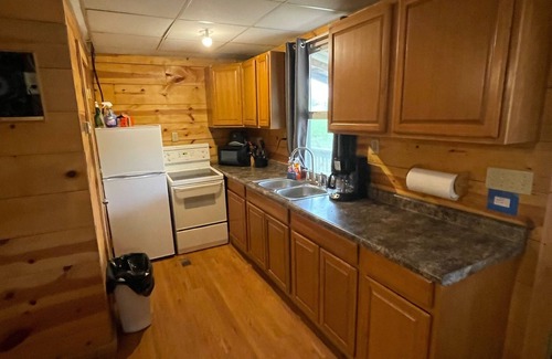 The cabin has air conditioning, an electric furnace heater, ceiling fans, wood burner, leather couch, futon, and a large fire pit! It has beds to sleep 7 (possibly 8 with children - please see below for a description of the bedding arrangement), has satellite TV in the living room (the bedroom has a TV but needs a streaming device [that you provide] plugged into its HDMI port), a stereo system with Bluetooth, full kitchen with range, refrigerator, and microwave. Outside, there is a propane grill on the front porch. There is also ample space for a nice campfire to roast hot dogs and make S'Mores!