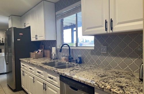 The home interiors provide a glimpse of Tucson’s welcoming relaxed ambience with a modern touch. All four bedrooms have room-darkening shades and TVs. The Galley kitchen is fully equipped and there is a family room off the kitchen with a large TV; it should be noted that the best part of this living space is the mountain view of Mount Lemmon and Sabino Canyon through the glass sliding door. Also, a guest favorite has been the little coffee nook next to the kitchen! The home also features a formal living and dining room, a perfectly divided space to enjoy some quiet and relaxing time, yet open enough to savor the fun in the kitchen and family room. All of the living spaces were designed to create spacious, relaxed, and cozy areas perfect for delightful gatherings.