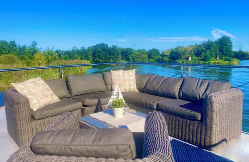Modern houseboat for up to 5 people on the Havel without a license is located in Ketzin/Havel. Modern houseboat for up to 5 people on the Havel without a license provides accommodation, featuring Security/Safety, Barbecue/Outdoor Cooking, Sports/Activities, among other amenities. This Boat Rental features Security/Safety, Barbecue/Outdoor Cooking, Sports/Activities, to make your stay a comfortable one.