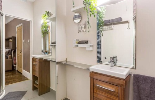 A beautiful ground floor double bedroom studio with en-suite facility and appointed kitchenette, includes toaster, coffee cafetière, kettle and free tea and coffee provided within a family home. Spacious work area and ample storage. The sofa bed has a new high quality memory foam mattress (bought Jan 2023) which will guarantee you a good nights sleep. We look forward to hosting you during your stay.