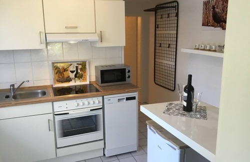 Kitchen: approx. 12sqm including Hallway and cozy seating area, SFBC with 4-burner electric cooker and oven, extractor hood, refrigerator with freezer, dishwasher, sink, microwave on request, espresso (Senseo capsule) machine, complete crockery and cutlery, wardrobe area.