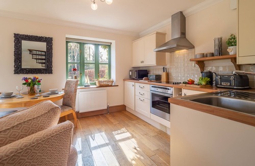 Molly's Den is a true delight - a relaxing and peaceful escape away from the stresses and strains of daily life. Although it's the perfect hideout for two, it's just as welcoming for a solo traveller looking for some quiet time out. On arrival, the clematis clad exterior and pretty blue windows set the scene. The light and airy country-style accommodation is laid out over two floors, with an open-plan living area and kitchen on the ground floor, along with a shower room. A cast iron spiral staircase leads up to the romantic bedroom above where you will find a luxurious super-king size bed dressed in Egyptian cotton linen. The bed can be split into full-size twin single beds if preferred (please request desired option on booking). The bedroom is flooded with light from windows to two sides and a Velux window above. Half open the shutters on the large arched window and enjoy being woken by a gentle filtered light. Outside the cottage, there is a courtyard garden with table and chairs, inviting you outdoors on sunny days to take a seat and enjoy a drink or bite to eat, while listening to the birds sing.