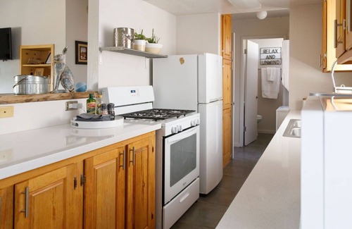 Stay at this two bedroom home with full kitchen located in Joshua Tree Village. The property is south of Twentynine Palms Hwy, near the visitor center, and 5 miles north of the National Park entrance. Walk to town for coffee, a drink, a meal; or just to browse in the shops featuring vintage items and local artwork. After a day of outdoor adventure, relax on one of the peaceful patios to enjoy a sunset and moongazing. Your first visit will not be your last!
