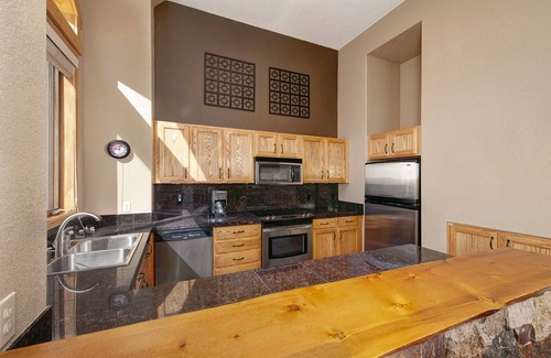 The large private primary bedroom with en suite bathroom is located on the top floor of the condo. It contains two walk in closets and a small reading nook overlooking the aspen trees. The main level opens up to a bright living room with leather couches, large windows, a flat screen tv, and a cozy gas fireplace. Next to the living room, you will find a fully equipped kitchen with custom made wooden counterspace as well as a dining area that seats up to six people. The deck next to the dining room offers easy access to the spacious kitchen. The bottom level contains the other two bedrooms with a queen in one and a twin with trundle in the other. The downstairs shared bathroom has plenty of counter space for all your belongings. There is also a small laundry room with a washer and dryer as well as a place to hang any clothes unsuitable for the dryer. Can accommodate up to 3 vehicles. One in the garage and two in the driveway.