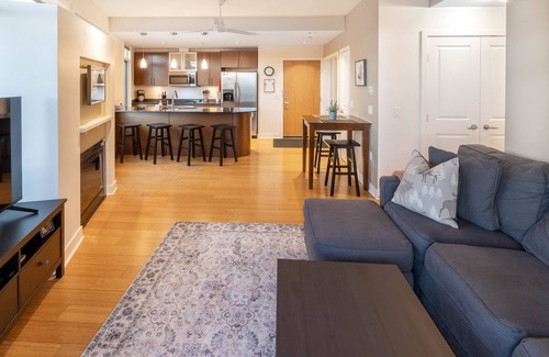 The living room has a large flat 55' screen smart TV. The TV comes with an excellent cable package and is equipped with apps such as Netflix for access to your own Netflix account. A comfortable couch and cozy electric fireplace complement the living area. In addition, the condo offers study den, ideal for those seeking to work from home!