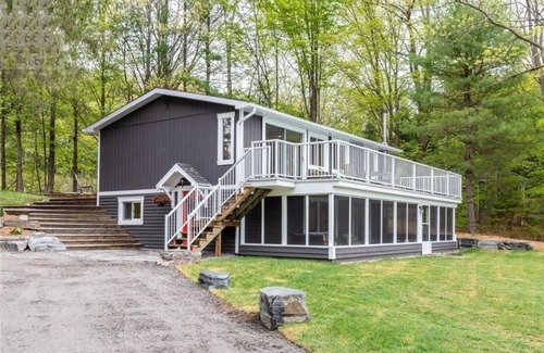 The cottage offers multiple sitting areas with walkouts from both levels. Main floor with open concept kitchen with stainless steel appliances and all the tools you need to prepare family feasts large island with seating for 3. Dining table seats 6, walkout to outdoor patio. Living room with 3- seater couch, 1 chair, smart TV, Casio Keyboard Piano. Lower lever with spaces living room equipped with wood burning firestove(seasonal use only). A large 3 Season Muskoka Room includes 4 seats patio sofa and tea table, an 8 seats outdoor dining table.And Laundry Facilities. Above the bunky there are 3 full size beds and an air hockey also a 3-seater couch with a coffee table, a perfect kids zoom.(no washroom above the bunky)