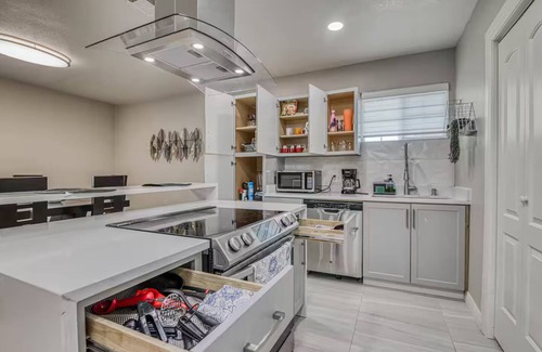 This spacious fully remodeled home offers a beautiful kitchen, 3 bedrooms, 2 of them have a queen bed, the other has a 2 Twin beds, all beds have very comfortable memory foam mattresses for you to have a better rest. Also a dining room with 6 chairs, and family room with a 65" Roku TV and super comfortable sofa, new ceramic flooring in bedrooms, upgraded appliances, and a fully equipped kitchen to make you feel at home, high-speed internet access and desk space available to work, It has air conditioning and central heating, it also has a large patio. Consider that the house has one to two steps in the main corridor which are marked so that you take care of your steps.