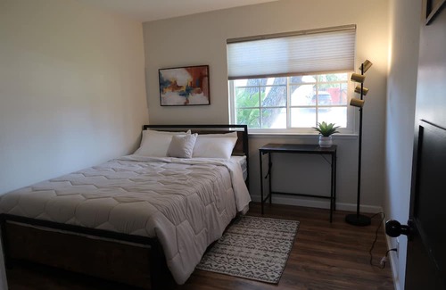 Beautifully remolded home with Quartz counter tops, modern light fixtures, stainless steel appliances, and wall art in every room. This single story home has, four bedrooms, and two baths, just under 1800 sq. ft. It has wood floors, two living rooms, a cute lounge area, and kitchen. The neighborhood has a relaxed and cozy vibe with plenty of parking in driveway or street. Nice walking neighborhood in a circular loop and can walk to the local park a few blocks away.