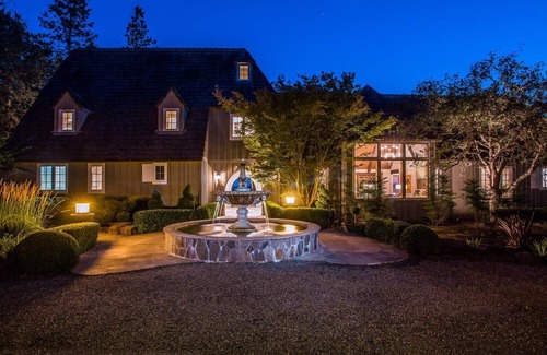 With its European-inspired charm evident in every detail, Napa Valley Mountain Retreat boasts polished hardwood floors, an open floor plan, and elegant furnishings. The two-story great room, smaller TV lounge, fully equipped kitchen, and dining room with seating for ten create an inviting ambiance.