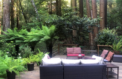 THE HOME | OUTDOOR SPACE: On just under one acre, this is a great home for relaxing or using as a jumping off point to enjoy the San Francisco/Bay Area. From every vantage point, you will see redwood trees, giant Australian Tree Ferns and greenery. In front, as you can see from the photos, we have an 800 sqft deck with a fire pit, lounging area, and multiple dining areas to take in the beauty of the mammoth redwoods & ferns and sound of the creek that runs in front of the deck. Additionally, we have a large upper balcony with access from the living room and master bedroom. In the backyard you will find a wooden hot tub and large garden. We also have a patio off the kitchen perfect for lounging.