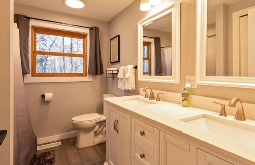 Drive up our long circular driveway to our 2100 square foot split-level home with front and rear decks. The main-floor living area is comprised of an open floor plan living, kitchen and dining areas with a slightly vaulted ceiling. The main-floor dining room sliders open up onto our large rear deck, complete with dining table and seating for 8, as well as gas grill. Upstairs from the main level, you will find four bedrooms (1 master bedroom with a king bed and a half bath, and 3 bedrooms with queen beds), as well as a full bathroom with double vanities and tub. Downstairs from the main level, you will find a newly-renovated 2-bedroom (one king bed and one queen bed) apartment with a full bath, with stand-up shower, rain head, shower wand and bench, as well as full living and kitchen areas leading out to a rear patio and fire pit with Adirondack chairs and hot tub. The house has forced air heat, plus mini split units throughout for additional comfort and temperature control.