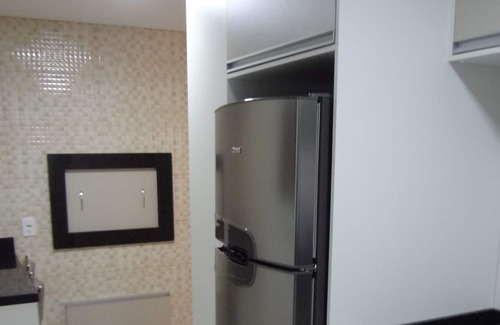 Full kitchen with refrigerator duplex, gas stove, electric oven, microwave, barbecue, small appliances and other household items, bench with 2 seats.