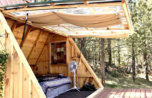 The A frames come equipped with a mini fridge, coffee/tea kettle, mugs, king bed, linens, sheets, towels, heater, picnic table and table top grill. When open, the attached deck doubles your living space!