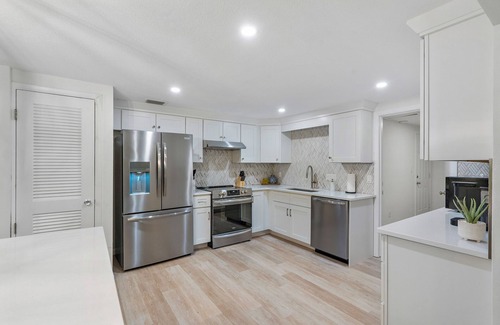 The fully remodeled kitchen is equipped with stainless steel appliances and beautiful quartz countertops, perfect for preparing delicious meals. We've thought of every detail to make you feel right at home, with a microwave, blender, baking sheets, and Mr. Coffee. You'll also find a brand new washer and dryer in a separate, spacious laundry room for your convenience.