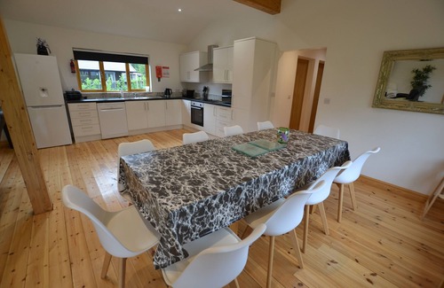 Spacious open-plan living room incorporating kitchen, dining area and sitting area (with 65" smart TV)