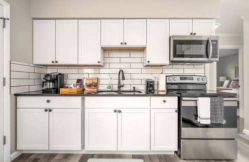 Enter into a welcoming space where a small front porch leads you to a warm cozy living room. The Space is full of natural light and furnished with a plush couch and a 55” TV for your entertainment. The home's layout flows seamlessly, featuring two serene bedrooms. The first luxurious king-size bed and the other with a queen-size bed. Both bedrooms enhanced with chic linens and blackout shades for a restful sleep.