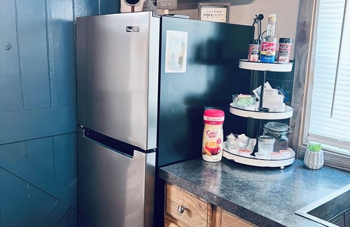KITCHEN: Well-equipped with pots, pans, dishes, cups, wine glasses, bowls, coffee maker, coffee, tea, sweetner, creamer, silverware, tea kettle, full-sized refrigerator, blender, toaster and spices