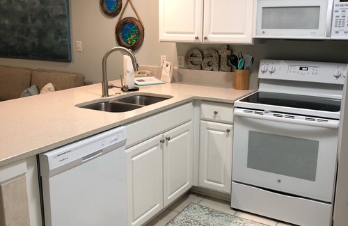 The Living Area has comfortable seating with a brand new sofa and easy chairs, as well as a 50” Smart Television. The adjacent kitchen, offering Quartz counter tops, is fully equipped with both small and NEW large appliances, as well as cookware and utensils for all of your cooking needs. There are four bar stools for dining. (And a folding card table in the master closet for puzzles and games!)
