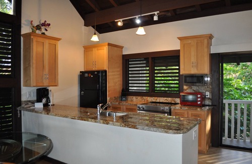 Even though you will get the plantation feel from staying at our unit that does not mean that you will miss out on any of the things you have left from home. There are two bedrooms. One with a king sized bed and the second has two twin beds. There is a full sized pull out sofa bed upstairs in the living room. The unit also comes with newly improved digital cable on a large screen with CD and DVD players. The unit is equipped with its own wifi internet. The Kitchen is also updated with modern cookware, microwave, Mr Coffee coffee maker and toaster oven. We have also added a wet bar where you can have fun preparing your own Mai Tai's, set up a buffet for you or your guests, or just display all your farmers market fruits. Don't forget to utilize the newly updated barbecue area right next to us at the lagoon to cook up some fantastic local fish and veggies.