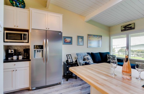 This oceanfront condo is conveniently located within easy walking distance of the beach and the Gearhart Golf Links, so come prepared for a fun weekend with both surf and turf options! As you pull up to the home, you’ll notice it’s behind a fenced area that contains a patio space with a table seating four and two colorful Adirondack chairs where you can sit and chat with friends. Enjoy crisp coastal air and briny breezes as you get the weekend kicked off with some barbecuing on your electric grill, provided here on the patio.