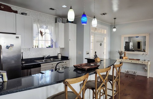 The interior of the cottage is open and spacious living/dining/kitchen area that is great for family and friend time. The cottage includes roku enabled flat screen TVs in the living room and both bedrooms. WIFI is Free during your stay. The kitchen is fully equipped with service for 8 or more with full size stainless steel appliances, garbage disposal, dishwasher, and a stocked Coffee/Tea Bar, making meal preparation easy for you and your family throughout your stay - even Holidays! Meals can be enjoyed in the dining area or screened porch.