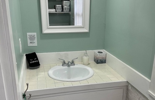 Sleeps 6. Main level does have 2 steps down to other parts of the cabin. 2nd bedroom is a loft with a queen bed and a ladder to access. Main bedroom provides a queen bed and Queen futon. Additional linens, pillows and blankets are provided. Bathroom has soap, shampoo, conditioner and hairdryer. Kitchen is stocked with cooking supplies, dishes and utensils for six, microwave, coffee pot with coffee pods, creamer, sugar and coffee cups. Full size refrigerator. Apartment size stovetop/oven.