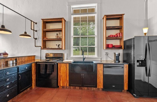 Step back in time with this stunning 2-bedroom 1 bath studio, beautifully restored to reflect the charm of its age. The downstairs bedroom is tucked away in the bank building’s original vault, and vintage charm is everywhere—from tin ceiling tiles to classic furnishings and a even a water bed downstairs. Upstairs is another bedroom with a king size bed, offering a birds eye view of the entire studio. The black-and-white tiled bathroom features a luxurious shower and your choice of a toilet or urinal. Whether you're looking for a memorable & restful overnight stay or a charming affordable venue for a baby shower, bridal shower, or birthday party, this space is perfect. You're sure to make awesome memories with a stay at our place.