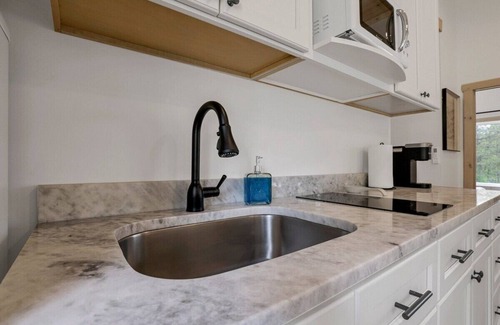 When you walk into the Onyx you will find a living space with a kitchen, dining table for two, and a couch and 50" TV. Through the large sliding door we have a covered porch with Adirondack chairs and a wood burning fire pit. The kitchen has a fridge, microwave, and two burner cook top. We also have a Keurig K cup coffee maker. In the bedroom you will find large windows, a queen bed, TV with DVD player and a closet. We have a stackable washer/dryer in the hall closet. In the full bath there is a walk in shower with glass sliding door. Outside there is a paved sidewalk leading to the covered hot tub area.