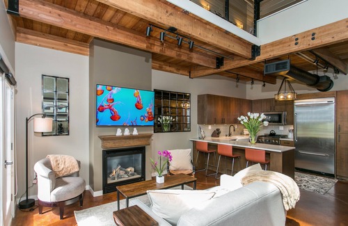 This one-of-a-kind industrial loft features a kitchen fit for a gourmand, commercial appliances, eating bar, sleeper window-seat, gas fireplaces, washer, dryer & walk-in closet. Furnishings include king bed, articulating 60" 4K TV, & drafting desk work area. Located in the heart of Orenco Station, just up the road from Nike & surrounded by Intel's three primary fab plants. 9 dining establishments, 4 parks, New Seasons grocery store & light rail within 1/4 mile. Enjoy cosmopolitan living at its finest.