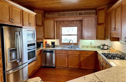 Enjoy our peaceful single level 3 bedroom/ 2 bath home on Lake Lahusage. Relax on the screen porch or sit on the dock. Swim in the lake and bring your kayaks/ SUP and fishing pole. Our beautiful rock home is very private on a 1 acre wooded lot that is perfect for family groups and friend get togethers. This is not a party house and booking guest must be 25 yrs or older per insurance requirements. No animals are allowed on property. This is not just a rental but our vacation home we rent when we are not using it. The house has Starlink internet and the 2 tvs are logged into Roku, Tubi and Freevee. The kitchen is well stocked and has a regular drip coffee maker with ground coffee. The diningroom seats 6+ and is a great place to play the board games provided. The screened porch is a relaxing place to watch the activities on the lake or read a book. A propane grill is on the back deck for you. The livingroom is cozy and the fireplace has a string of flame like lights as the fireplace is nonoperable and cannot have a fire . The tv is 50". The master bedroom has a king bed, room darkening shades, a small electric fireplace and a tv. The attached bathroom has a claw foot tub and a standalone shower.The 2nd bedroom has a queen bed and room darkening shades. The 3rd bedroom has a full size bed and room darkening shades. The 2nd bathroom is in the hallway between the living room and bedrooms # 2 & 3. The house has its own private dock . You can launch your kayaks and SUP from the yard or sit on the dock and enjoy the water. The Lahusage Dam is walking distance from the house.